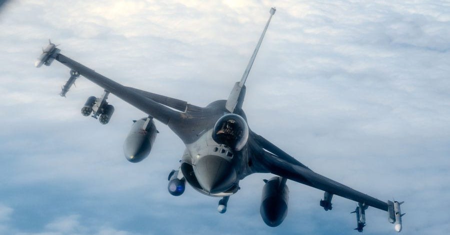 On Thursday, Telegram channel Avia OFN posted a grainy photo of one of the Ukrainian air force’s roughly 50 ex-European Lockheed Martin F-16 fighters (out of around 90 pledged) flying with a heavy load of fuel and weapons—and, it seems, an under-nose AN/AAQ-33 Sniper targeting pod.