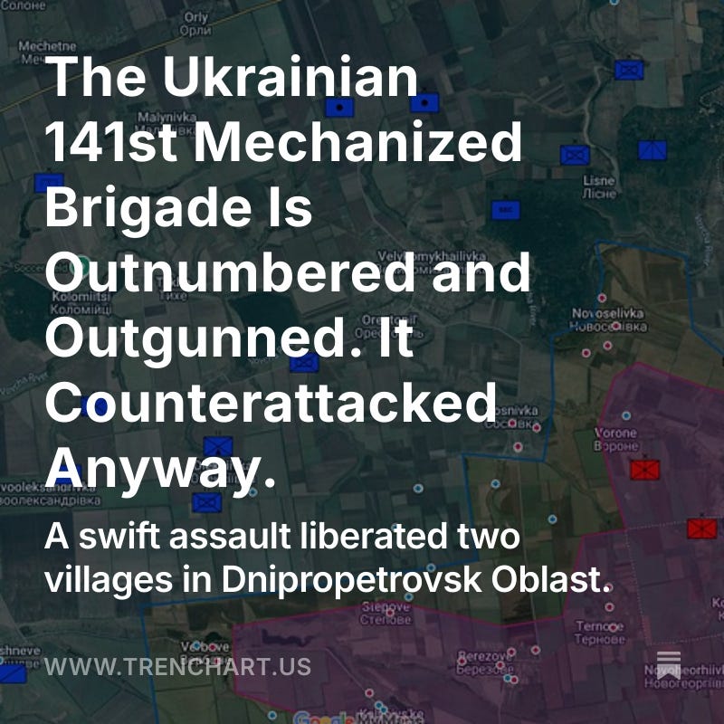 According to mapper Playfra, Russian forces control Novohryhorivka at the border of Dnipropetrovsk and Zaporizhzhia Oblasts, as well as a trench system south of Novohryhorivka that was supposed to help slow the Russians—but is now serving as a staging base for the attacking Russians.