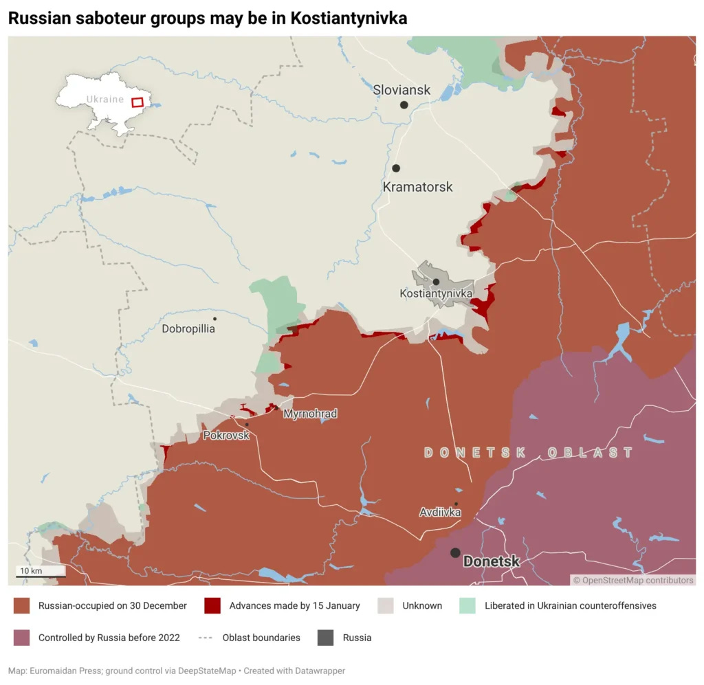 Russian infiltrators may have marched into the westernmost districts of Kostiantynivka in eastern Ukraine’s Donetsk Oblast