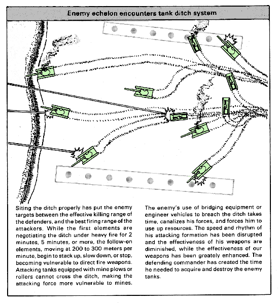 For as long as tanks have existed, berms and ditches have been among the best defenses against them. The U.S. Army’s Field Manual 5-102 explains the benefits of berms and ditches that are, respectively, too tall and too wide for tanks to cross on their own. “The speed and rhythm of [the enemy’s] attacking formation has been disrupted [and] the defending commander has created the time he needed to acquire and destroy the enemy tanks.”