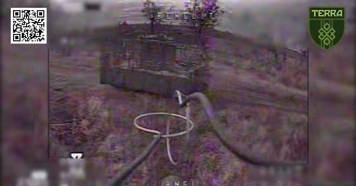 The strange Russian vehicle makes a brief appearance in a montage of recent drone strikes posted by the Ukrainian Terra drone team. The details are difficult to make out, but it seems the Russian Nagmachon is a tank hull with an approximately six-foot tower where its turret should be.